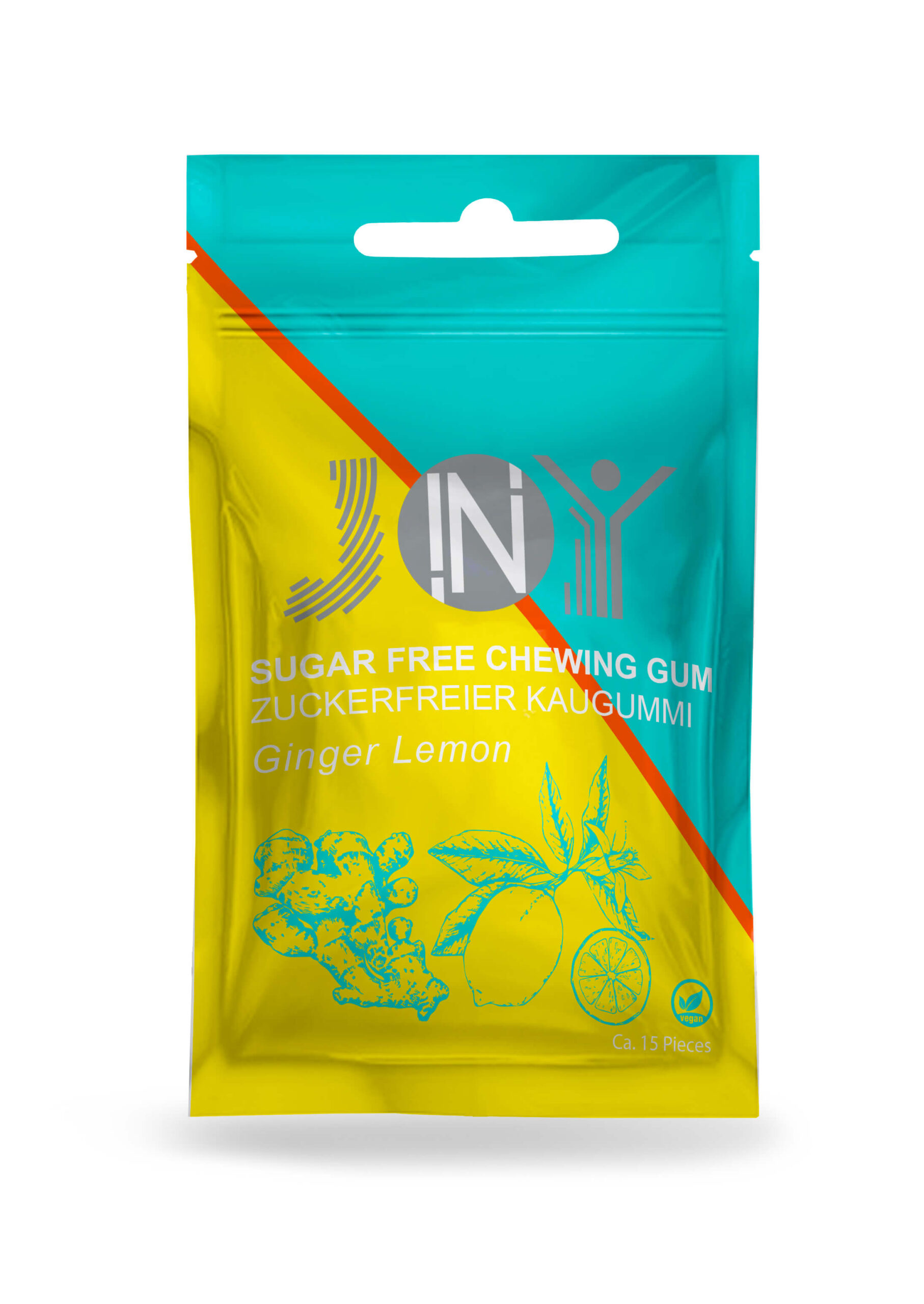 Sweeteners: Isomalt, sorbitol, xylitol (15%), maltitol syrup, isomalt, sucralose, acesulfame K; gum base contains emulsifier: SOY LECITHN), flavorings, ginger dry extract 5% gingerols (Zingiber Officinalis Rosc.) root; acidity regulator: citric acid; humectant: glycerol; vegetable concentrates (lemon, apple, safflower);  thickener: gum Arabic;  glazing agent: carnauba wax;  antioxidant: E306.